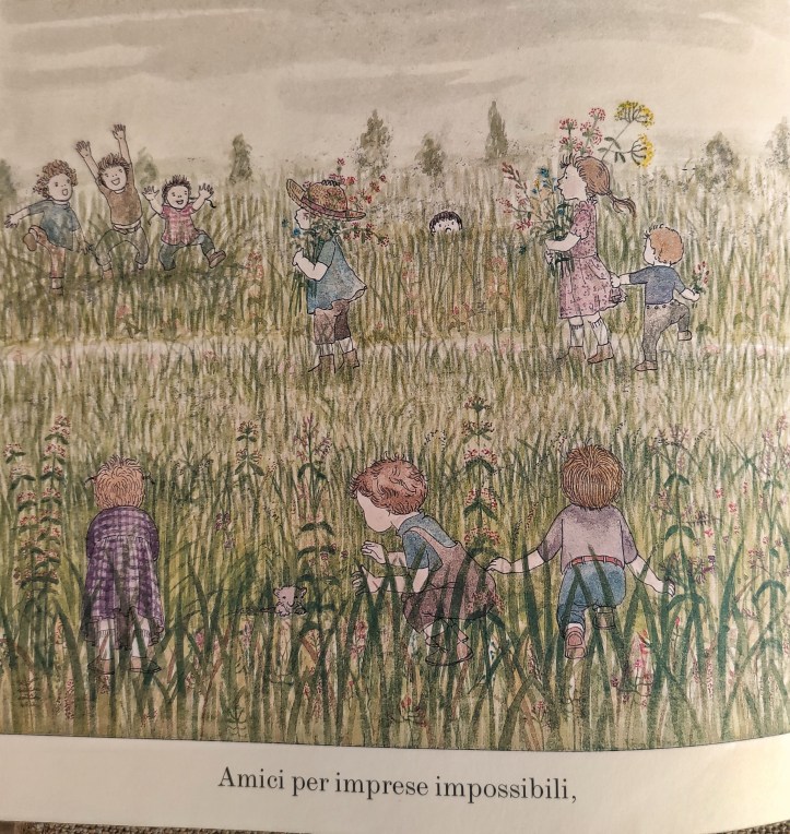 Ormai siamo al terzo incontro e la fiducia reciproca che si è instaurata mi ha permesso di utilizzare un albo illustrato bellissimo di Satomi Ichikawa, autrice giapponese, si intitola AMICI edito Orecchio Acerbo.