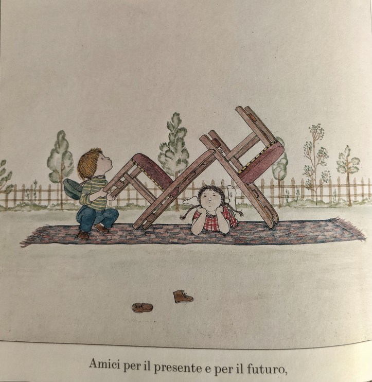 Il tutto è accompagnato da versi in rima, anche questi delicati ma diretti e pragmatici. Il mio obiettivo infatti era far sentire la musicalità della lingua e come fosse perfettamente in sintonia con le immagini. I bambini che seguo, di cui per questioni di privacy e correttezza eviterò di dire età e provenienza, parlano l’italiano da pochissimo tempo ma con risultati sorprendenti.