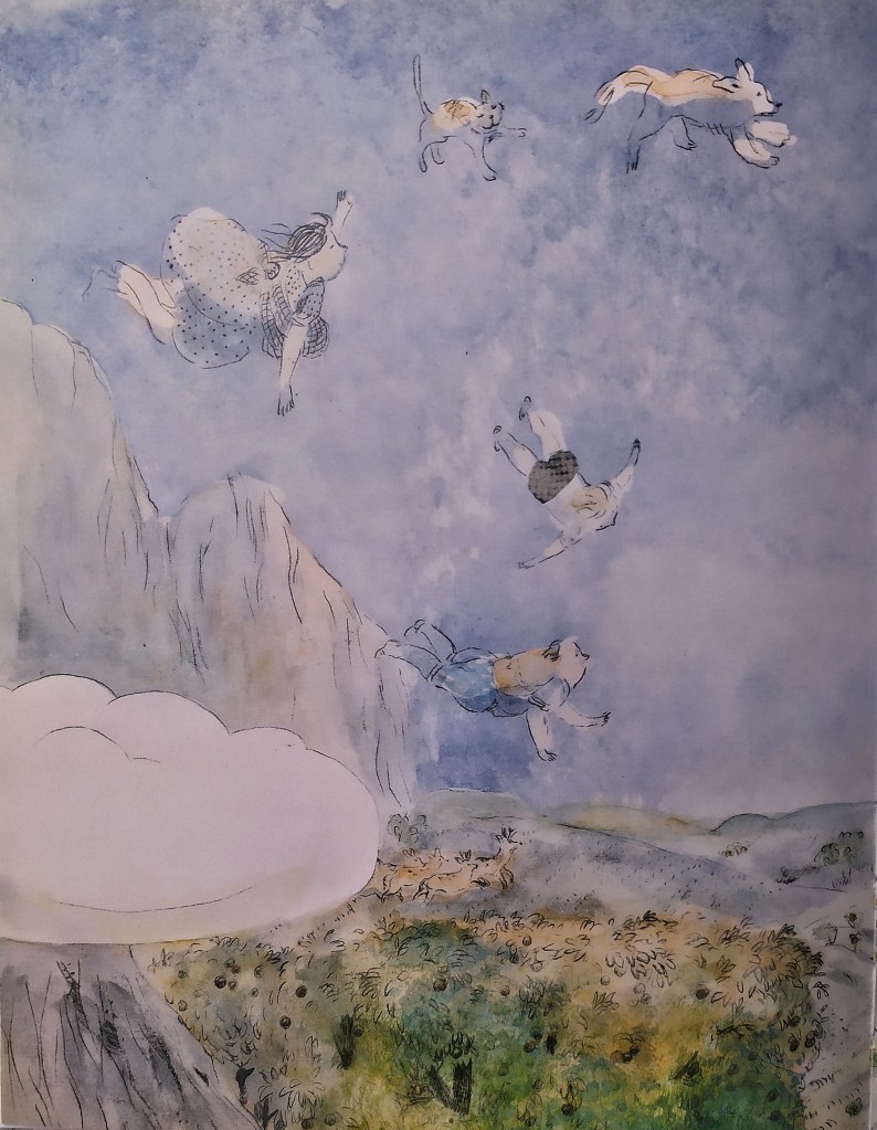 La descrizione del volo è talmente realistica che finchè non ho voltato pagina per mostrare le immagini i miei bambini, pur essendo di quarta e quinta elementare, ci hanno messo qualche momento prima di capire che la famiglia Knitter erano gli esseri umani delle immagini e non degli uccelli.