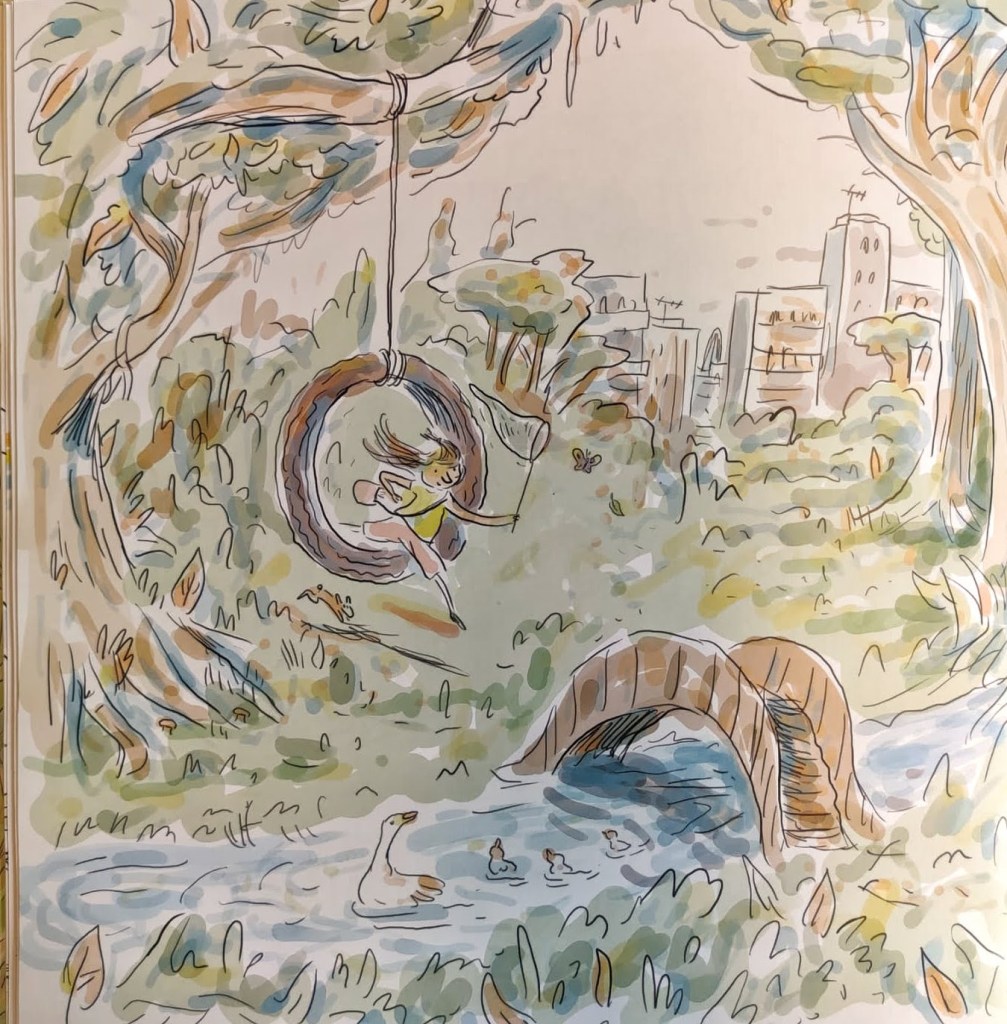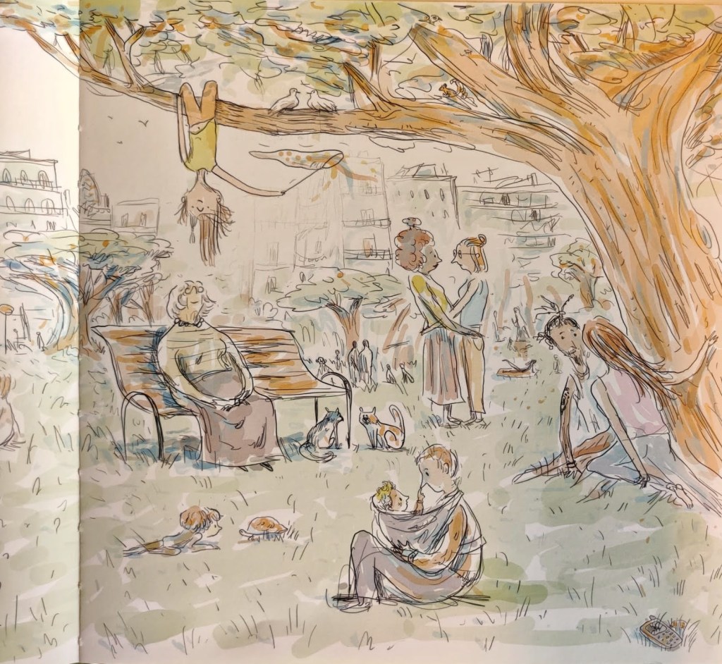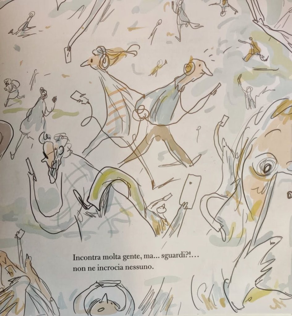 Questo anno è stato sospeso per tutti ma io in più ho dovuto gestire l’assenza improvvisa dei miei piccoli Acchiappasguardi ritrovandomi proiettata nello stesso mondo adulto da cui ero scappata. La realtà dei grandi fatta da distrazioni, computer, riunioni, cuffie, tablet e post sui social. Mi sono messa nei panni di Vera, quando il narratore di questo albo dice: