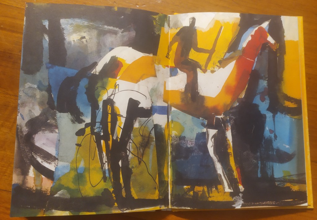 E come si inseriscono le illustrazioni in un progetto editoriale che deve necessariamente aggiungere e valorizzare senza distrarre dal contenuto? Naturalmente è proprio la casa editrice ad aver dato una svolta alla pubblicazione: sarà proprio Francesco a raccontarci di come sia riuscito a dare alle poesie di Silvia immagine e colore seguendo il consiglio dell’editore di andare oltre al significato provocatorio dei versi, ma di farli propri. Alla scelta di un’immagine che simboleggi tutto il lavoro svolto, Francesco ci mostra quella di un grande cavallo a doppia pagina con un bellissimo contrasto tra giallo e nero. L’idea nasce da un ricordo d’infanzia dell’illustratore e simboleggia il ragazzo che cavalcando l’animale rappresenta l’andare avanti, il cammino e percorso dell’adolescenza.