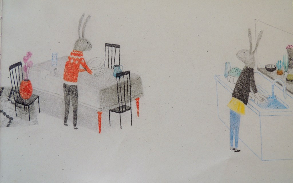 E adoro le illustrazioni di vita quotidiana così simile alle nostre: il papà sparecchia, la mamma fa i piatti, Oscar fa i capricci, la mamma si arrabbia, il papà prepara il latte della sera e così via…fino alla meravigliosa immagine di due genitori che silenziosamente si defilano dalla cameretta in attesa di godersi una serata insieme!