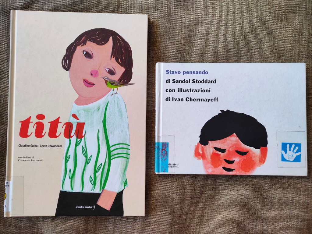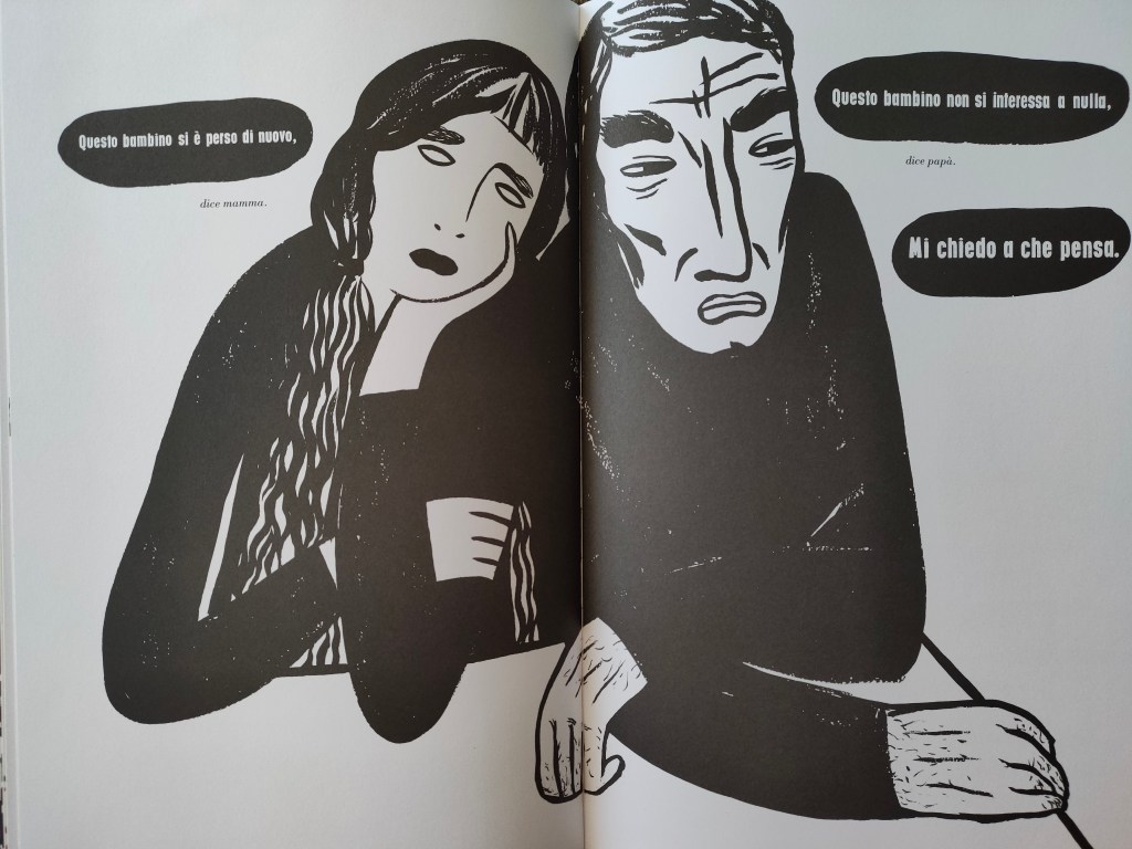 Ho scelto questi due albi perché sono i libri che leggerei a tutti gli adulti, genitori o non, compresa me stessa. Si tratta di due storie molto diverse, la prima è un percorso interiore nella vita di Titú, un bambino silenzioso che nel suo mondo si ritrova appesantito dalle continue lamentele che l’adulto fa su di lui. Le pagine si alternano tra i colori dei pensieri di Titú e il bianco e nero della vita degli adulti.