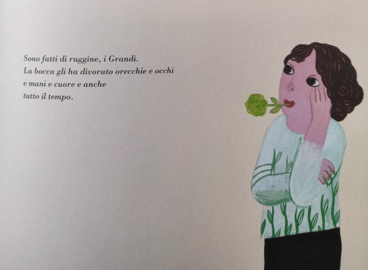 “Sono fatti di ruggine, i Grandi. La bocca gli ha divorato orecchie e occhi e mani e cuore e anche tutto il tempo. I Grandi sono troppo GRANDI per abitare nel mio paese.”