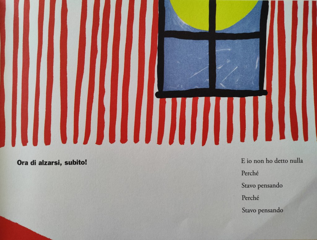 Ma la testa del bambino va al contrario, rallenta e pensa pensa pensa a tutto, tranne che a quello che l’adulto pretende da lui. La traduzione di Tognolini è poetica e allegra, le immagini sono solari, con forti contrasti che ricordano davvero la mente felice di un bambino.