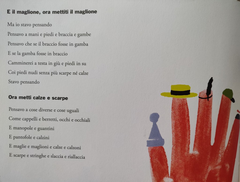 “E allora me ne vado. Li lascio. Esco dalla finestra. Nuvoleggio con le nuvole. Sfarfallo con le farfalle. Arrossisco con le rose. Rimbombo con il rombo. Formicolo con le formiche. Brineggio con la brina Girasoleggio con… Cammino con…” Titú, Claudine Galea e Goele Dewanckel, edito Orecchio acerbo