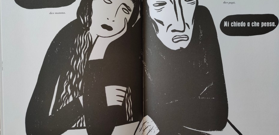 Ho scelto questi due albi perché sono i libri che leggerei a tutti gli adulti, genitori o non, compresa me stessa. Si tratta di due storie molto diverse, la prima è un percorso interiore nella vita di Titú, un bambino silenzioso che nel suo mondo si ritrova appesantito dalle continue lamentele che l’adulto fa su di lui. Le pagine si alternano tra i colori dei pensieri di Titú e il bianco e nero della vita degli adulti.