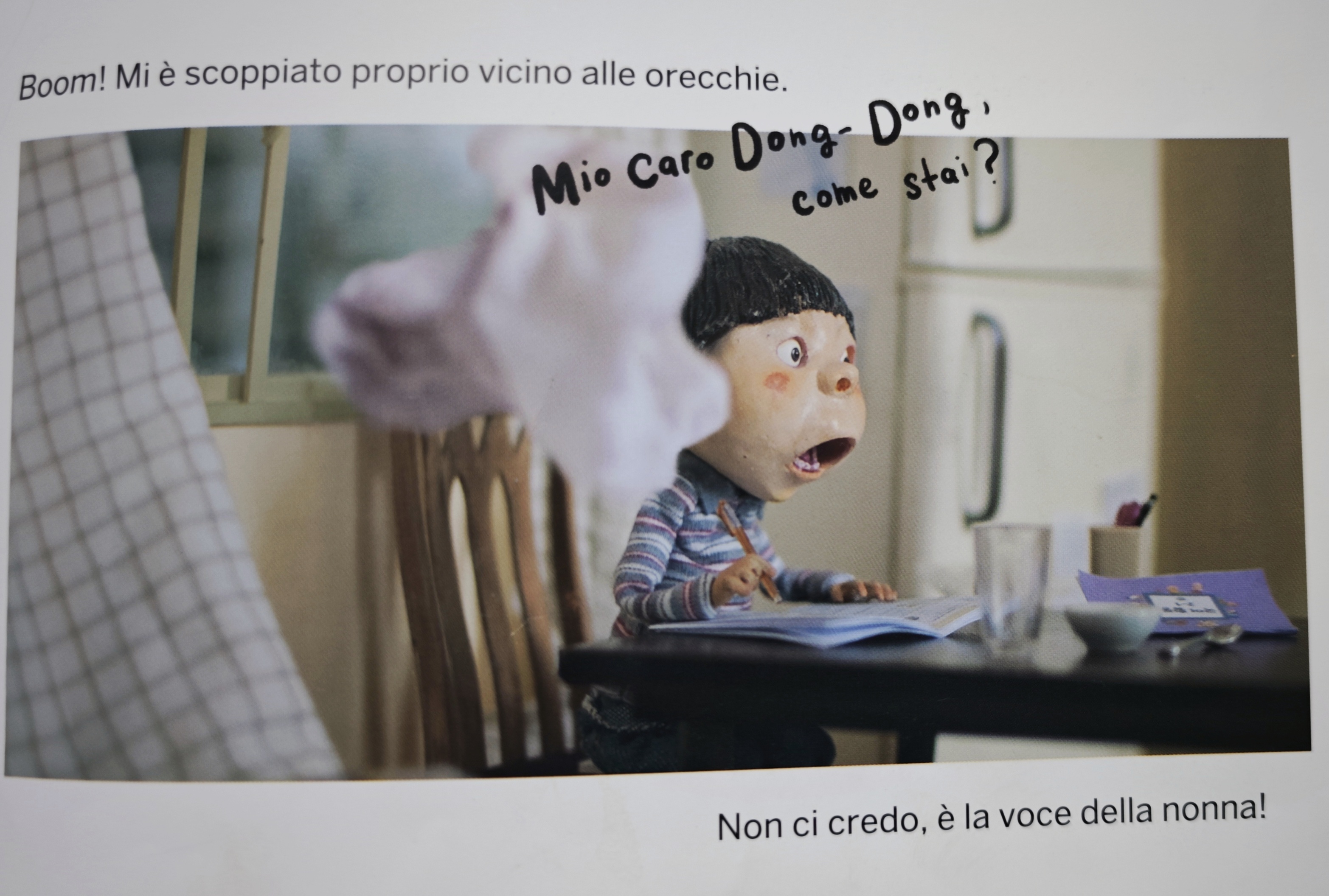 Le caramelle sono come un invito per Dong Dong: a comunicare, ad ascoltare, a stupirsi, a ricordare il passato. Come? Con un dialogo interiore fatto di parole ma anche di abbracci: il divano gli ricorda le buone maniere, il vecchio cane gli confessa quanto si senta esausto delle sue passeggiate, il papà che mentre ricopre Dong Dong di domande e rimproveri ha in realtà un sottotesto ben preciso, “TI VOGLIO BENE”, e la nonna che non c’è più lo rassicura che laggiù va tutto alla grande.