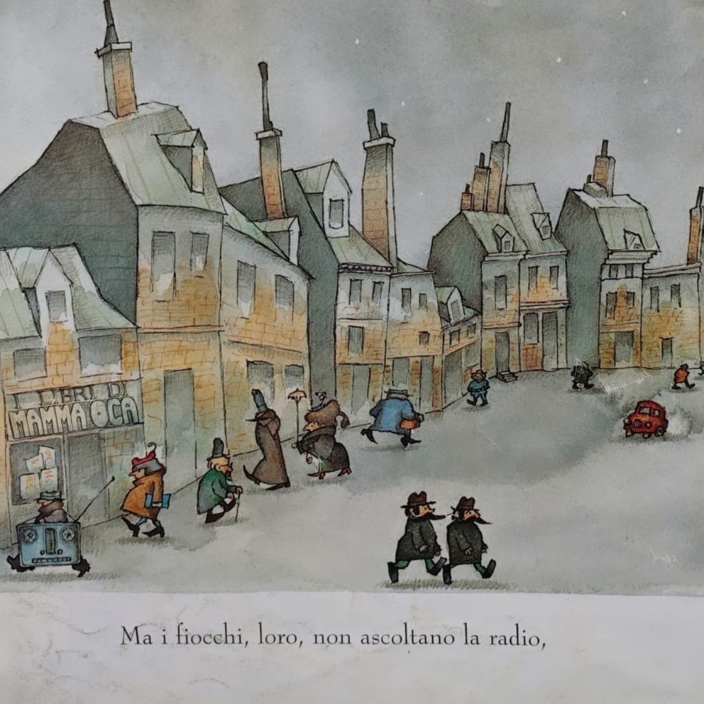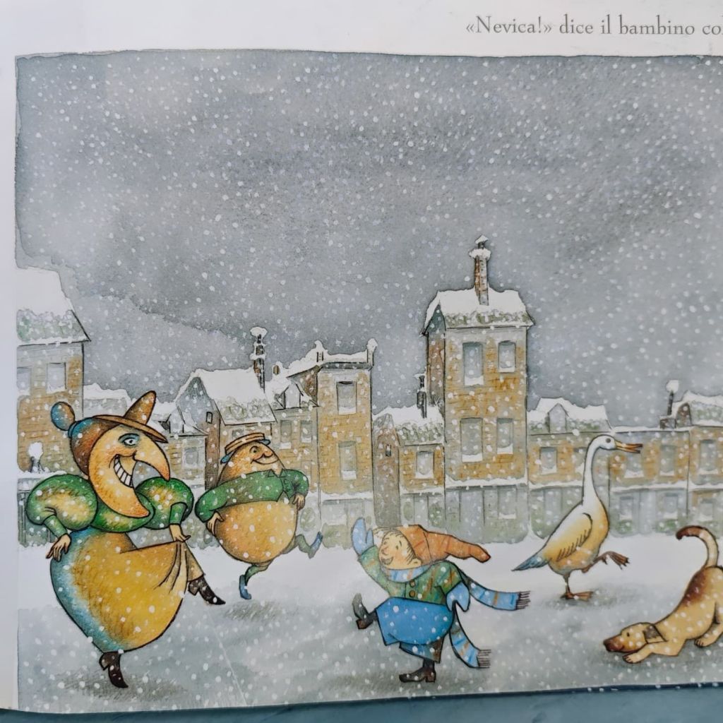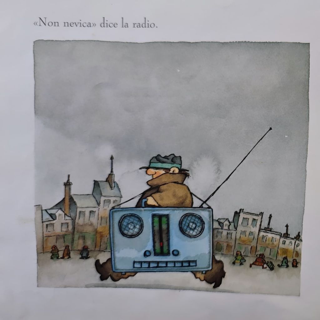 Poi mi piace molto come vengono presi in giro gli adulti e il loro bisogno incondizionato di contraddire l’infanzia. Il piccolo protagonista ci annuncia aria di neve ma nessuno gli crede: la neve però se ne frega, non ascolta la radio e non guarda la TV e arriva, arriva, arriva… scende, scende, scende… Queste ripetizioni sono tipiche degli albi illustrati, per dare ai piccoli lettori una cadenza ritmica della lettura che faciliti la comprensibile della storia.