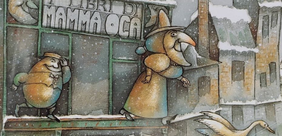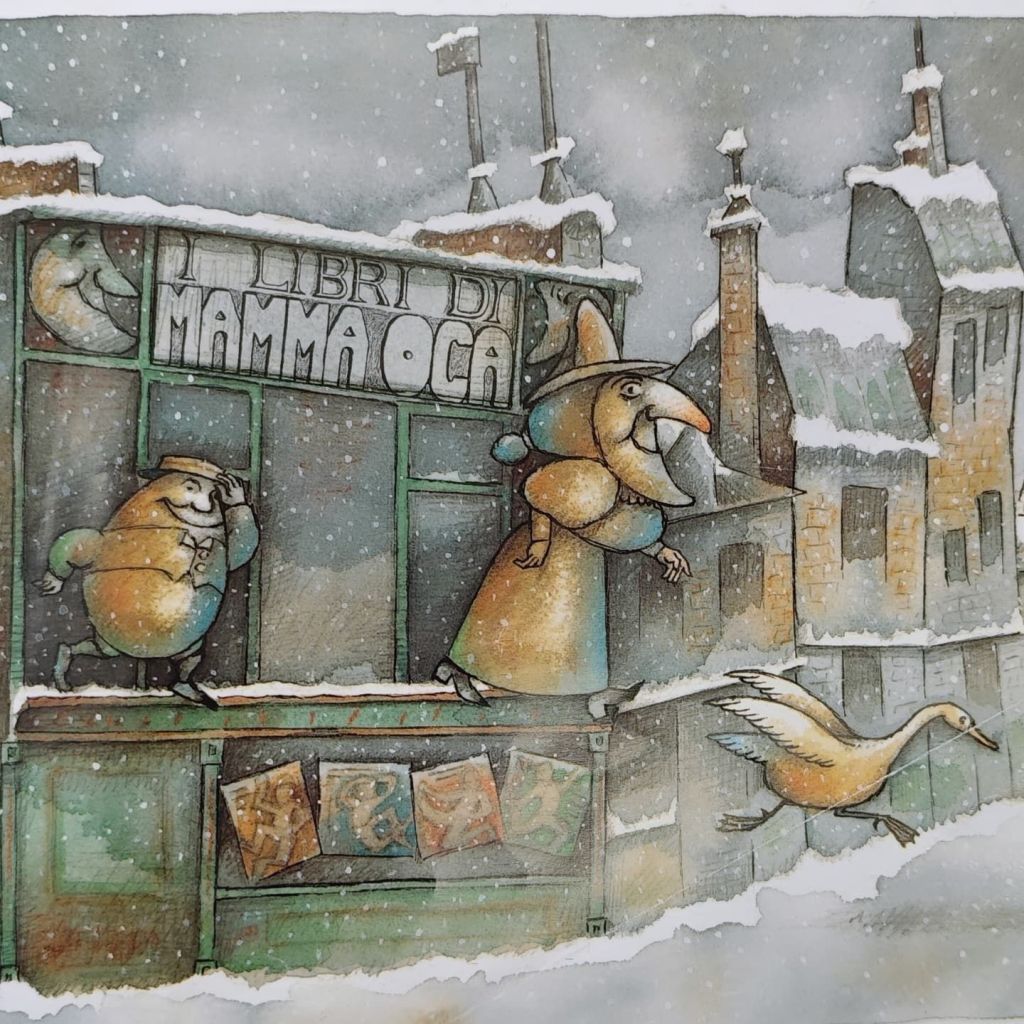Io mi sono innamorata di questo albo…innanzitutto del negozio I LIBRI DI MAMMA OCA: l’insegna con i suoi “abitanti” a mala pena si nota all’inizio delle storia ma poi diventerà parte integrante della narrazione e ci farà sognare!