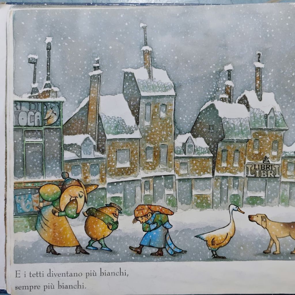 Quando la neve arriva i personaggi della libreria di Mamma Oca prendono vita, saltano fuori dall’insegna del negozio e dopo un profondo inchino iniziano a danzare insieme al bambino protagonista e al suo cane.